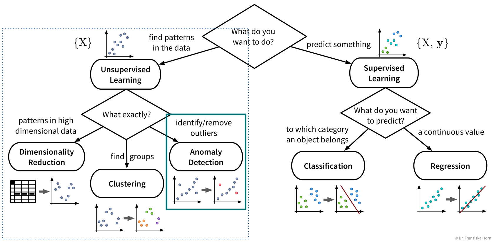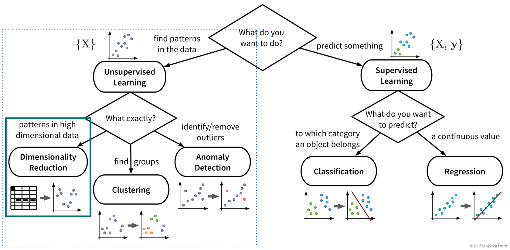While the subfields of unsupervised learning all include lots of different algorithms that can be used for the respective purpose, we’ll always just examine a few example algorithms with different underlying ideas in more detail. But feel free to, e.g., have a look at the sklearn user guide for more information about other methods.