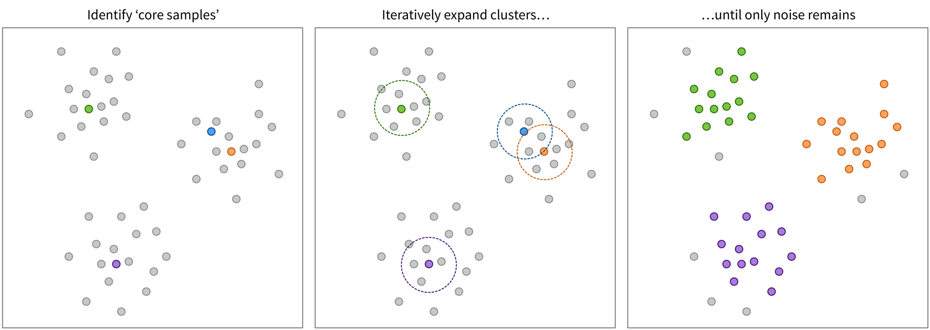 Find ‘core samples’ in dense areas of the data and then expand the clusters by iteratively including points with a distance < eps.