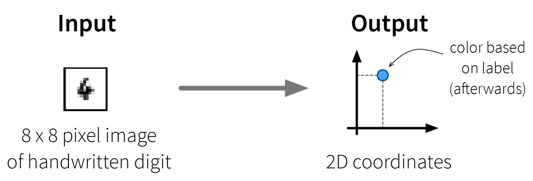 The remarkable thing here is that these methods did not know about the fact that the images displayed different, distinct digits (i.e., they did not use the label information), yet t-SNE grouped images showing the same number closer together. From such a plot we can already see that if we were to solve the corresponding classification problem (i.e., predict which digit is shown in an image), this task should be fairly easy, since even an unsupervised learning algorithm that did not use the label information showed that images displaying the same number are very similar to each other and can easily be distinguished from images showing different numbers. Or conversely, if our classification model performed poorly on this task, we would know that we have a bug somewhere, since apparently the relevant information is present in the features to solve this task.