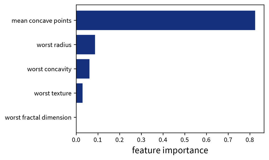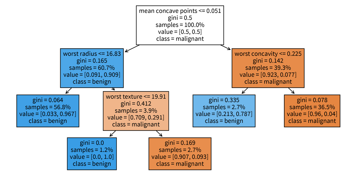 sklearn. The decision tree has its root at the top (where we start when predicting for a new sample) and the leaves (i.e., those nodes that don’t branch off anymore) at the bottom (where we stop and make the final prediction). Each node in the tree shows in the first line the variable based on which the next split is made incl. the threshold value (except for leaf nodes), then the current Gini impurity (i.e., how homogeneous the labels of all the samples that ended up in this node are; this is what the decision tree internally optimizes, i.e., notice how the value gets smaller on at least one side after a split), then the fraction of samples that ended up in this node, and the distribution of samples for the different classes (for a classification problem), as well as the label that would be predicted for a sample at this point. So when making a prediction for a new sample with a decision tree, we start at the root node of the tree and then follow the branches down depending on the sample’s feature values until we reach a leaf node and would then know exactly based on which feature thresholds the prediction for the sample was made.Global interpretation: a trained decision tree or random forest has an attribute feature_importances_, which indicates how much each feature contributed to reducing the (Gini) impurity. This is related to the position of the feature in the tree and how many samples pass through the respective node.