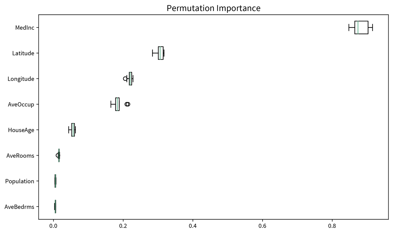 Since a single permutation of a feature might by chance shuffle the values in a way that is close to the original ordering, this process is performed multiple times, i.e., we get a distribution of the permutation importance scores for each feature, which can again be visualized as a box plot: