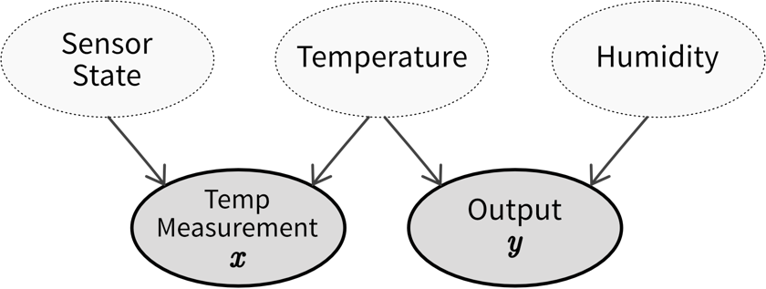 - a temperature sensor immersed in water amasses limescale and after a while the temperature reading is not accurate anymore, e.g., if the true temperature is 90 degrees, a clean senor measures the true 90 degrees, but after it has accumulated some layers of limescale, it only measures 89 degrees under the same circumstances. While our output is influenced by the true temperature, we only have access to the sensor reading for the temperature, which is additionally influenced by the state of the sensor itself ⇒ try to estimate the amount of accumulated limescale, e.g., based on the number of days since the sensor was cleaned the last time (which also means that these kinds of maintenance events need to be recorded somewhere!)