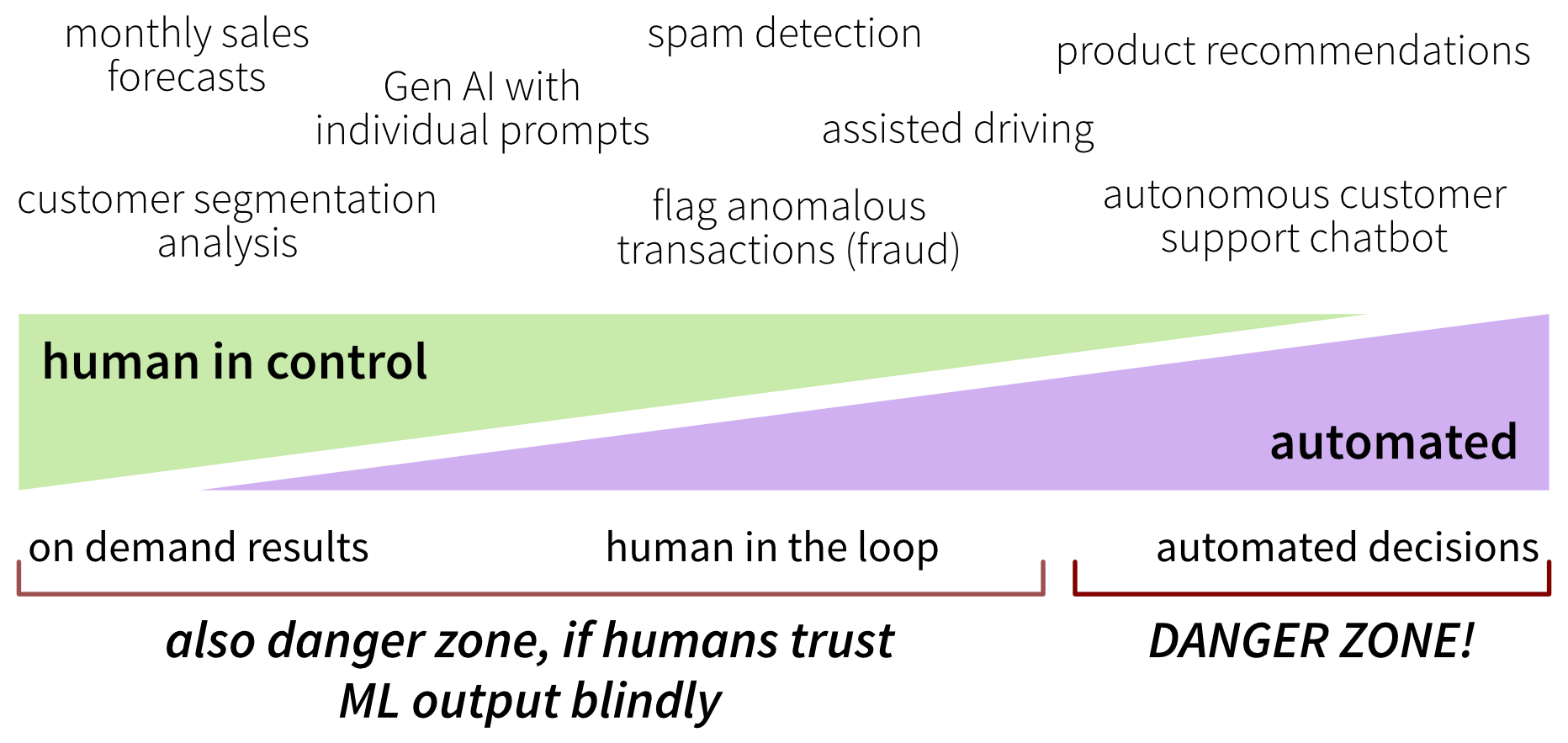 In most cases, ML models are not harmless when they make mistakes. Some applications, such as product recommendations, are relatively low risk: even incorrect outputs usually do little more than mildly annoy users. For the majority of other use cases, however, it is best to keep a human in the loop. Humans may actively drive the process—for example, by using model outputs as decision support when planning inventory based on sales forecasts—or intervene only selectively, such as reviewing results when something looks suspicious, periodically checking a spam folder, or validating high-impact decisions when the model is uncertain. However, this control mechanism only works if humans actually review the ML outputs and do not trust them blindly!