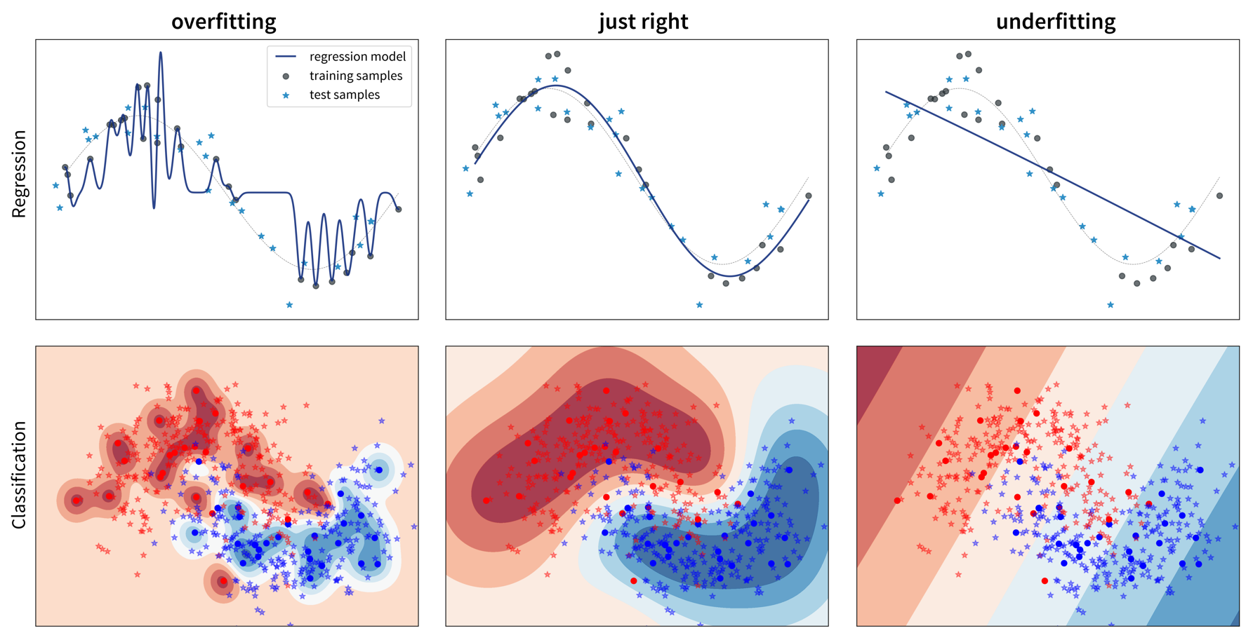 Since most datasets have lots of input variables, we can’t just plot the model like we did above to see if it is over- or underfitting. Instead we need to compute the model’s prediction error with a meaningful evaluation metric for both the training and the test set and compare the two to see if we’re dealing with over- or underfitting: