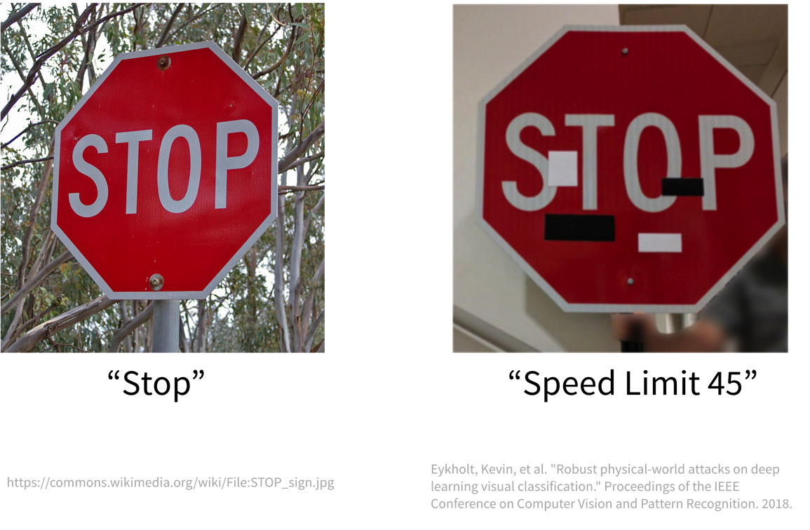 For example, while an ML model can easily recognize the ‘Stop’ sign from the image on the left, the sign on the right is mistaken as a speed limit sign due to the strategically placed, inconspicuous stickers, which humans would just ignore: