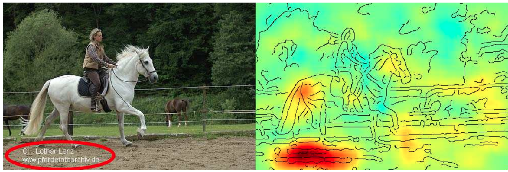 The graphic below is taken from a paper where the authors noticed that a fairly simple ML model (not a neural network) trained on a standard image classification dataset performed poorly for all ten classes in the dataset except one, horses. When they examined the dataset more closely and analyzed why the model predicted a certain class, i.e., which image features were used in the prediction (displayed as the heatmap on the right), they noticed that most of the pictures of horses in the dataset were taken by the same photographer and they all had a characteristic copyright notice in the lower left corner.