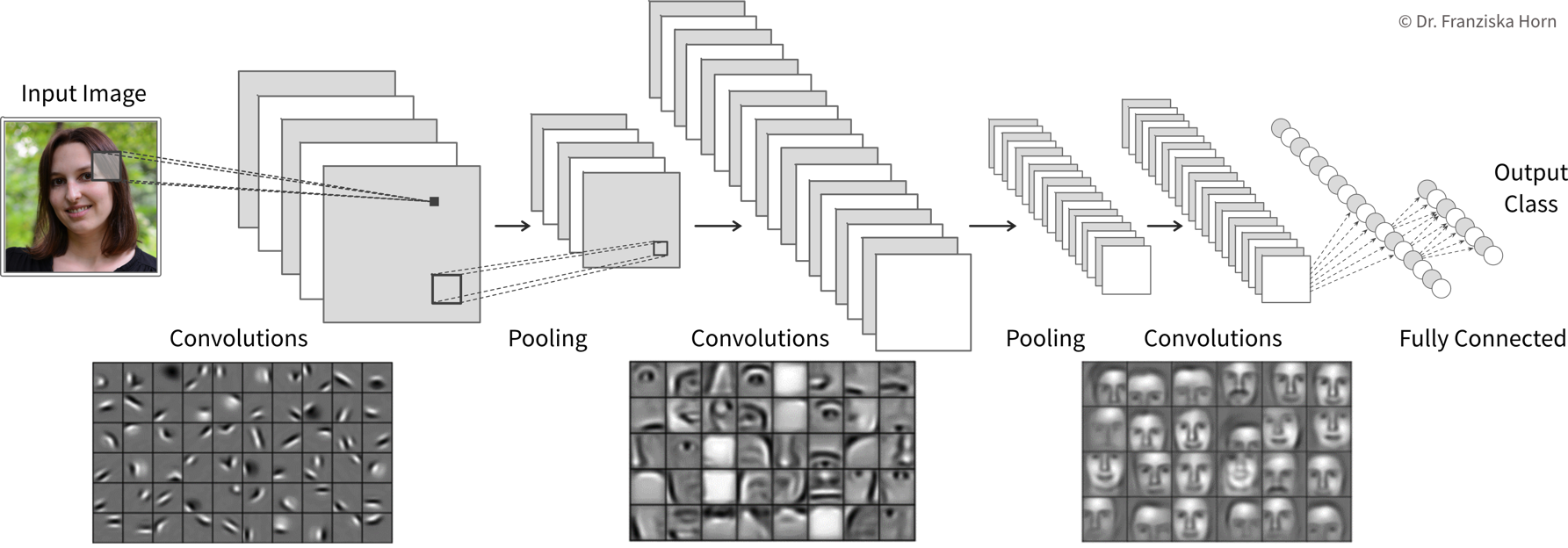 Eine convolutional neuronale Netzarchitektur zur Gesichtserkennung: Die gelernten Gewichte des Netzes sind die unterhalb des Netzes angezeigten kleinen Filterpatches, die beispielsweise im ersten Schritt Kanten im Bild erkennen. Gegen Ende des Netzwerks werden die Feature Repräsentation zu einem Vektor zusammengefasst und als Input an ein FFNN (hier “Fully Connected Layer”) gegeben, um die endgültige Klassifizierung durchzuführen.