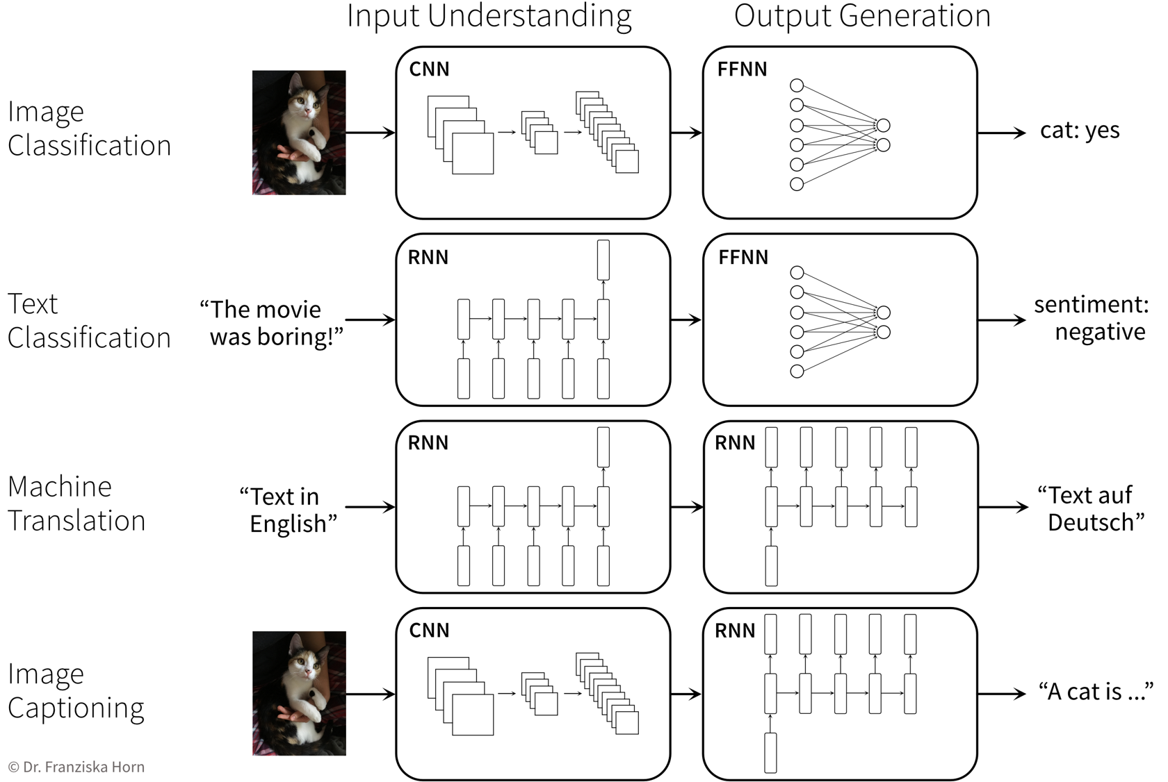 Wie wir oben beim CNN für Gesichtserkennung (Bildklassifizierung) gesehen haben, wird die vom CNN generierte Repräsentation irgendwann zusammengeführt und ein FFNN berechnet daraus die endgültige Vorhersage für die Klassifikation. Genauso kann auch der letzte Hidden State eines RNN, der die in einem Satz enthaltenen Informationen repräsentiert, an ein FFNN übergeben werden, um die finale Klassifikation zu generieren (z.B. für eine Sentimentanalyse). Einige Probleme fallen jedoch nicht in die Kategorie einfacher Supervised Learning Aufgaben (also Regression oder Klassifikation) und erfordern eine andere Art von Output. Bei der maschinellen Übersetzung ist der Output beispielsweise ein in eine andere Sprache übersetzter Satz. Dies kann durch die Kopplung zweier RNNs erreicht werden: Das erste ‘versteht’ den Satz in der Originalsprache und diese Repräsentation der Bedeutung des Satzes wird an ein zweites RNN übergeben, das daraus Wort für Wort den übersetzten Satz generiert. Ein weiteres Beispiel ist Image Captioning (d.h. das Generieren einer Bildbeschreibung, z.B. um das Online-Erlebnis für Menschen mit Sehbehinderung zu verbessern), wobei das Bild zuerst von einem CNN ‘verstanden’ wird und dann diese Repräsentation des Eingabebildes an ein RNN übergeben wird, um den passenden Text zu erzeugen.