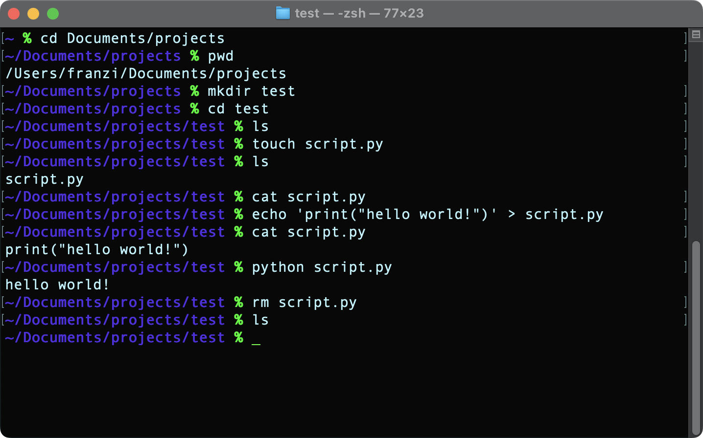 pwd: Print the current working directory—this shows the path to where you opened the terminal.ls: List files and directories in the current location. Usels -lafor more details, including hidden files (like.gitignore).cd path/to/folder: Change directory to the specified path. Tip: Press the tab key to autocomplete names. If the path starts with/, it’s absolute (from the file system’s root). If it starts with~/, it’s relative to your home directory. Use..to move up one folder.mkdir new_folder: Create a new directory namednew_folder.touch new_file.txt: Create an empty file namednew_file.txt.cp new_file.txt copied_file.txt: Copynew_file.txttocopied_file.txt. Usemvinstead ofcpto move or rename files.rm new_file.txt: Deletenew_file.txt. Add-rto delete directories. But be careful: files deleted this way bypass the trash and are gone for good, so double-check before hitting enter!